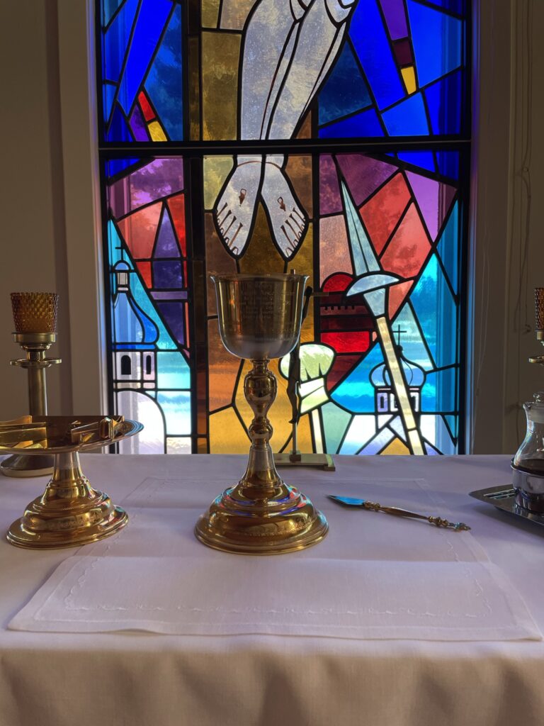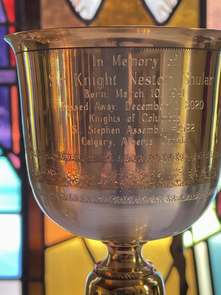 When a member of the Knights of Columbus Fourth Degree passes away, the Assembly traditionally will gift the widow with a chalice. On December 1, 2020, Sir Knight Nestor Shular passed away. He was a great friend of the Sisters, volunteering as their maintenance man when they had a community home in Calgary. Upon his retirement as a mechanical engineer, he continued volunteering his services for the sisters and the Church. Both Nestor and his wife, Diane, were close friends of Sisters. In conversation with Sister Laura Prokop and Diane, it was shared that the Mundare community was in need of a new chalice for their chapel. Diane was more than happy to designate her gift of the chalice to Sisters. She knew that this is something that Nestor would have liked.